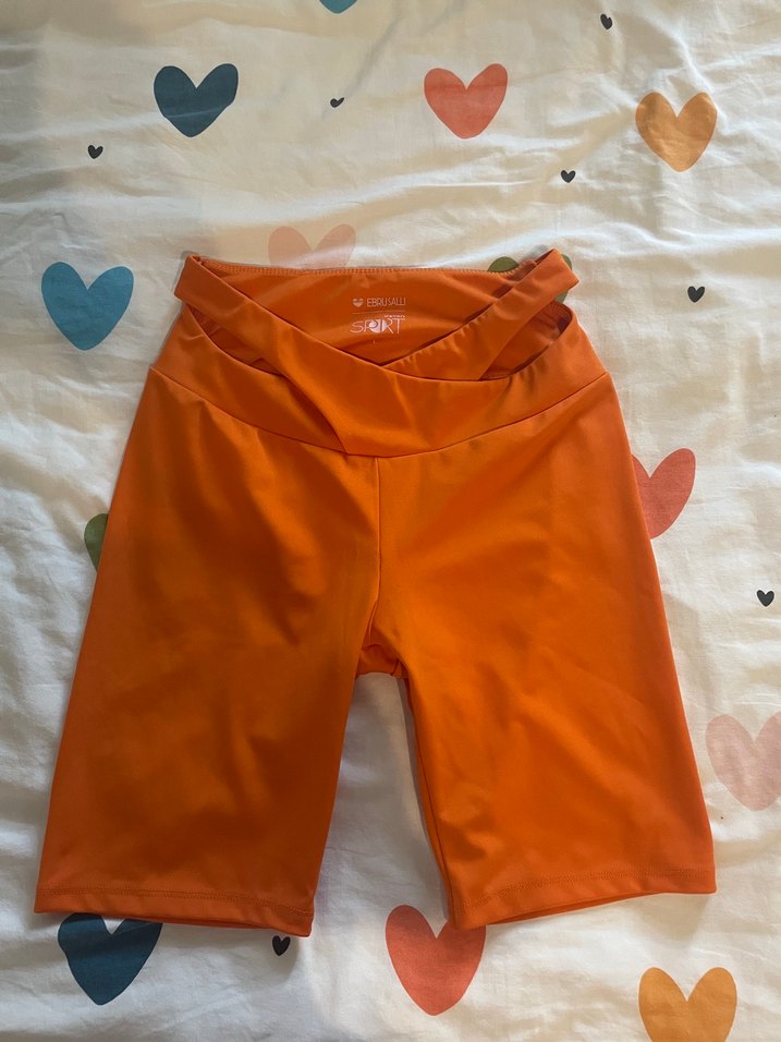 Parlak turuncu renkli, kuşaklı bel ve midi dar kesim şort. L beden