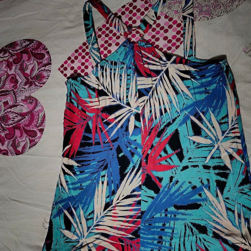 Kadın askılı straplez yaka ve drapeli tasarıma sahiptir. Koyu çok renkli baskılı deseniyle bohem tarzını yansıtır. Bir iki kez giyildi tertemiz