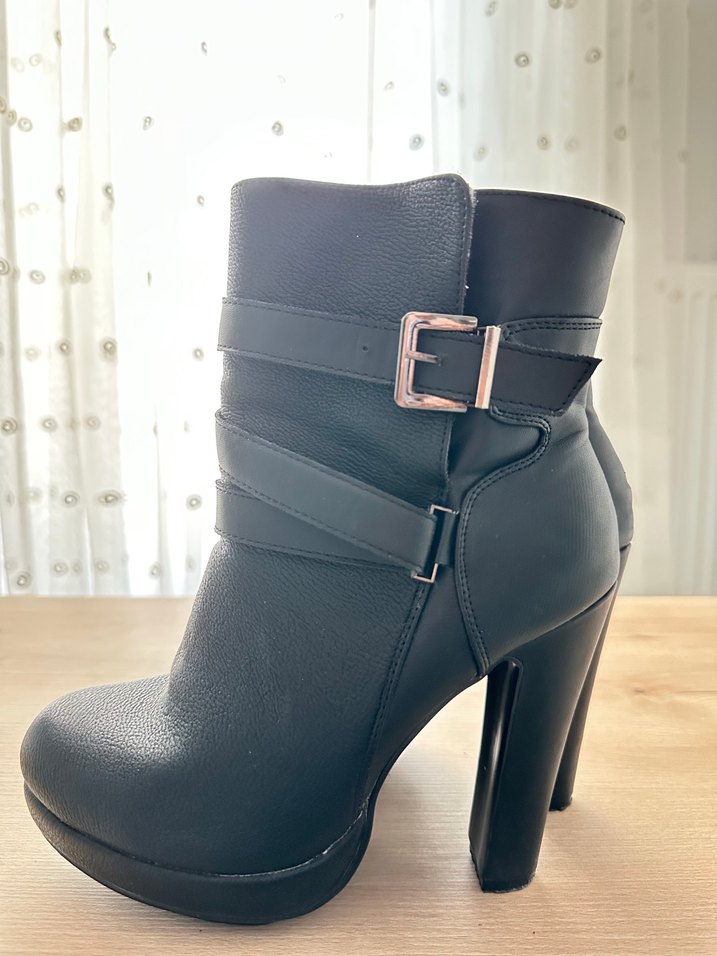 Koton marka siyah deri tokalı içi tüylü kalın topuklu bot. Çok rahat. Bir iki kez ancak giyilmiştir. İçi yünlü astar olduğu için ayağı çok sıcak tutuyor. 38 numara, 12 cm topuk boyu. Orjinal kutusunda