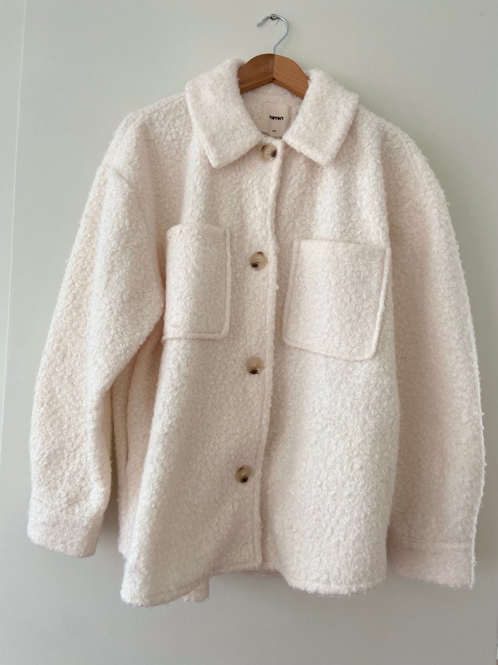 Düğmeli, uzun kollu, notalı yakalı kadın kaban. Yumuşak ve sıcak kumaştan, beyaz pastel renkte, bol kesim ve midi boyda, iki ön cepli.