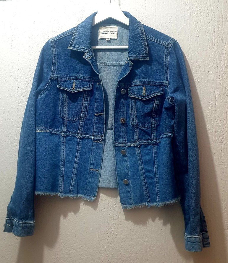 Koton Marka 40 beden Düğmeli, normal boyda mavi denim ceket. Uzun kollu, kesik yakalı ve parlak görünümlü, günlük sokak stili için uygun.