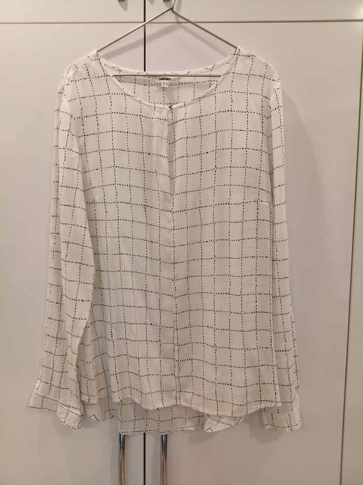 Çok kısa süre kullanıldı.S ve M bedenlere uyar . Yıkandı, tertemiz. Kadınlar için uzun kollu, bol kesim keten kumaştan gömlek. Yuvarlak yaka ve düğmeli ön kısmı, beyaz üzerine gri kareli desene sahip. Günlük kullanıma uygun.