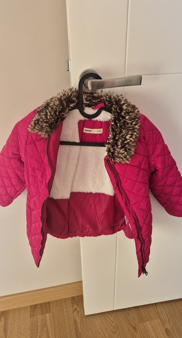Pembe renkli, kürk detaylı yakalı ve yumuşak iç astarlı kız çocuk montu. 4-5 yaş tertemiz sorunsuz durumda