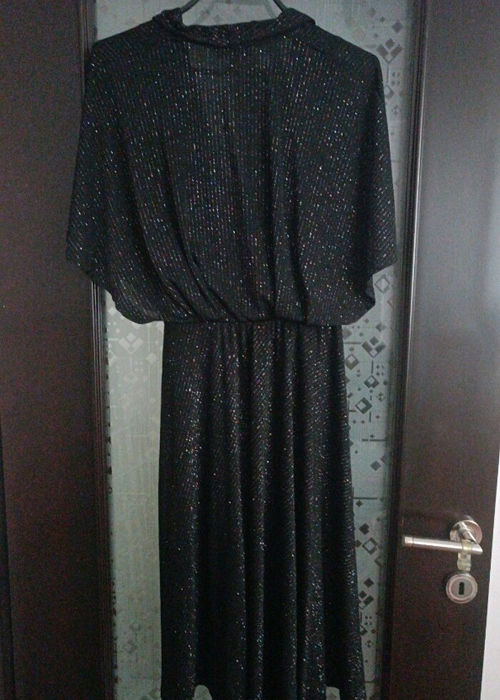 Koton marka bir kere giyilmiş tertemiz hiçbir kusuru olmayan parıltılı siyah elbise boyu diz kapağında ayarlayarak kısaltabirsiniz