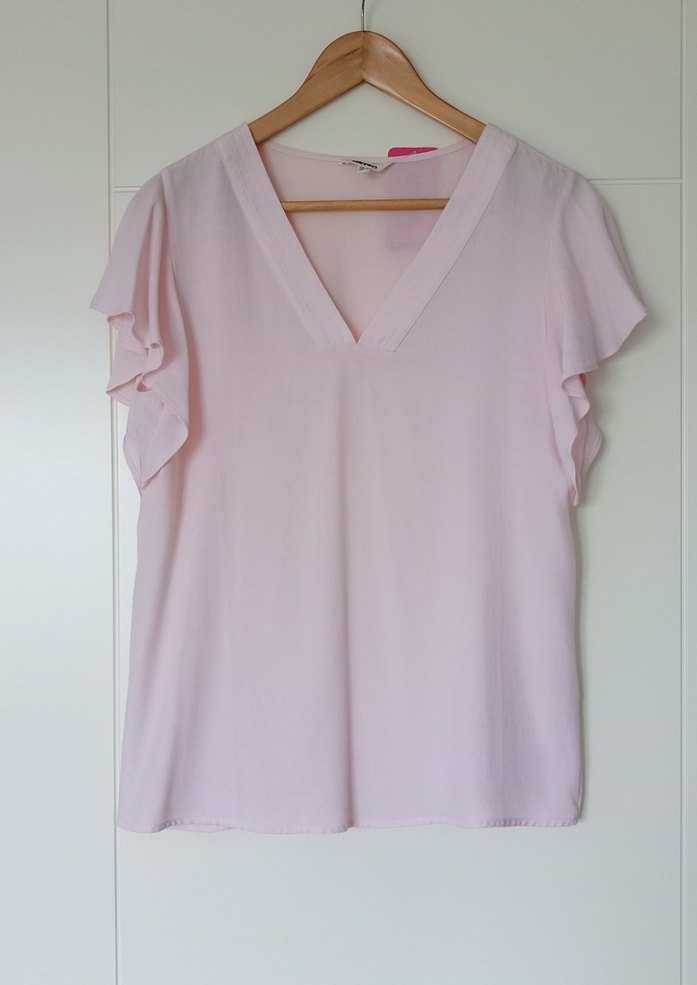 Pembe pastel tonlarında, V yaka ve kısa drapeli kollara sahip, bol kesim kadın bluz. İpek gibi yumuşak kumaştan, günlük sokak stili için uygun. Beden 36-38 arası