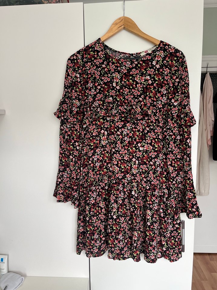 Koton marka 36 beden, S beden uzun kollu ve fırfırlı, çiçek desenli midi elbise. Salaş kesim ve yuvarlak yaka, günlük kullanım için uygun. Sadece bir kez giyilmiştir ve hiçbir sorunu yoktur.