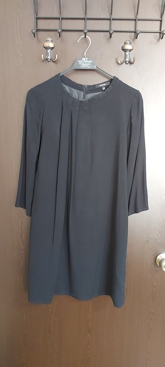 siyah renkli, uzun kollu, yuvarlak yakalı ve pilili detaylara sahip midi uzunlukta bol kesim elbise. Minimalist ve desen içermeyen tasarımıyla ofis için klasik şıklık sunar.