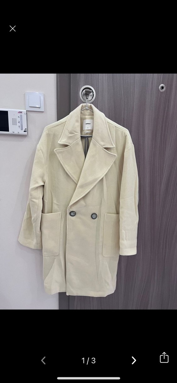 Krem rengi, çift düğmeli ve büyük yakalı kaban. İki öncepli, yumuşak dokulu klasik tasarım. 1 kez giyildi temiz hiçbir kusuru yok.