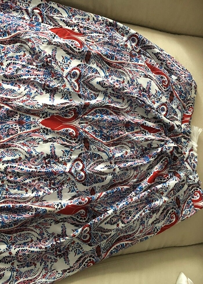 Az kullanıldı. Yanlardan cepleri var. Arkadan fermuarı var. İp kumaşı var. Herhangi bir hasarı yoktur. 1.58 boyundaki birisi için ayak bileğine kadar geliyor