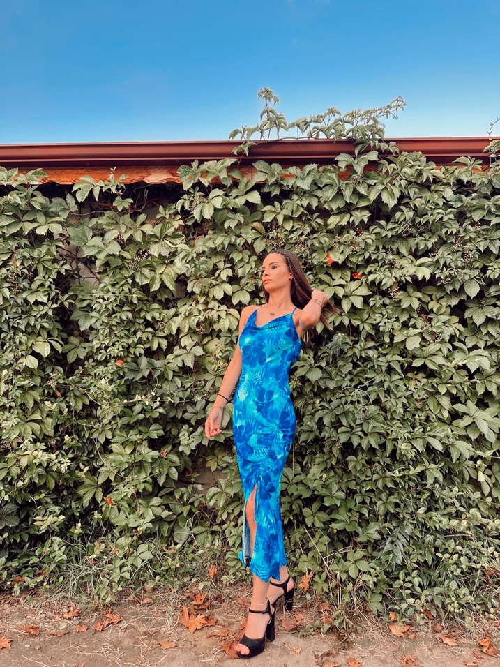 Parlak mavi bağlama desenli, drapeli ve uzun kesim, V yaka ve ince askılı, ipeksi dokulu elbise. Açık hava etkinlikleri için uygun.