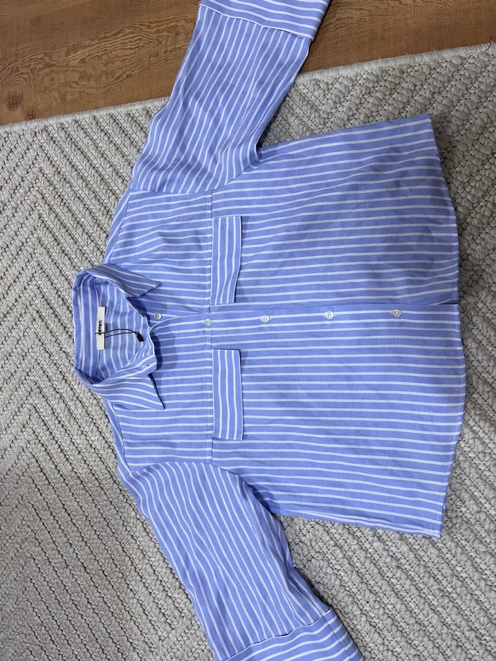 Kadın gömleği, Hafif mavi çizgili sentetik kumaştan, 3/4kollu ve bol kesimli, günlük kullanıma uygun. Hiç giyilmedi