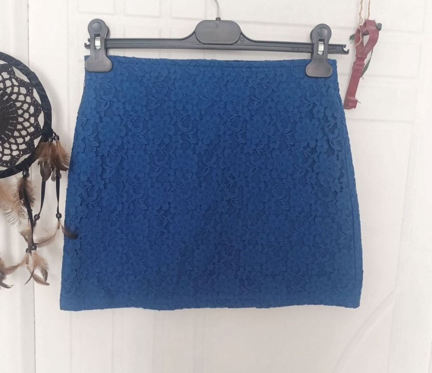 Saks mavisi, dantel desenli. Çok şık, bir kere bile giyilmedi çünkü kilo aldım. Beli gizli lastikli, fotoğrafta da görünüyor. Boyu 35 cm.