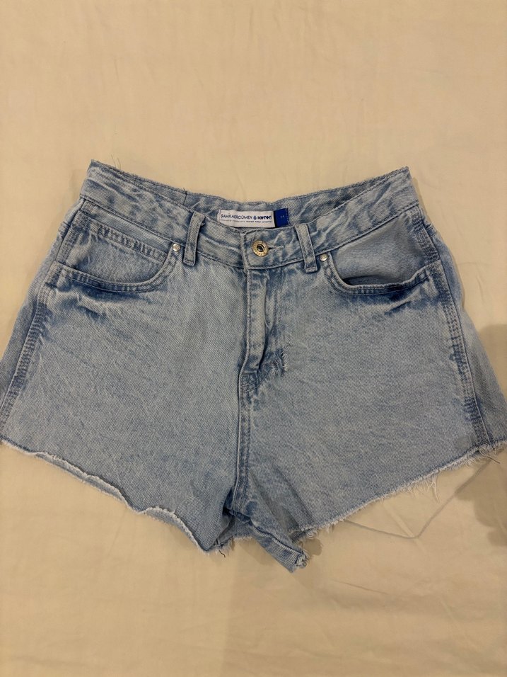 Pastel mavi renkli, bol kesim mini denim şort. Rahat sokak stili ve günlük kullanım için uygun. Kesik detaylı kenarlarıyla zahmetsiz şıklık sunar.