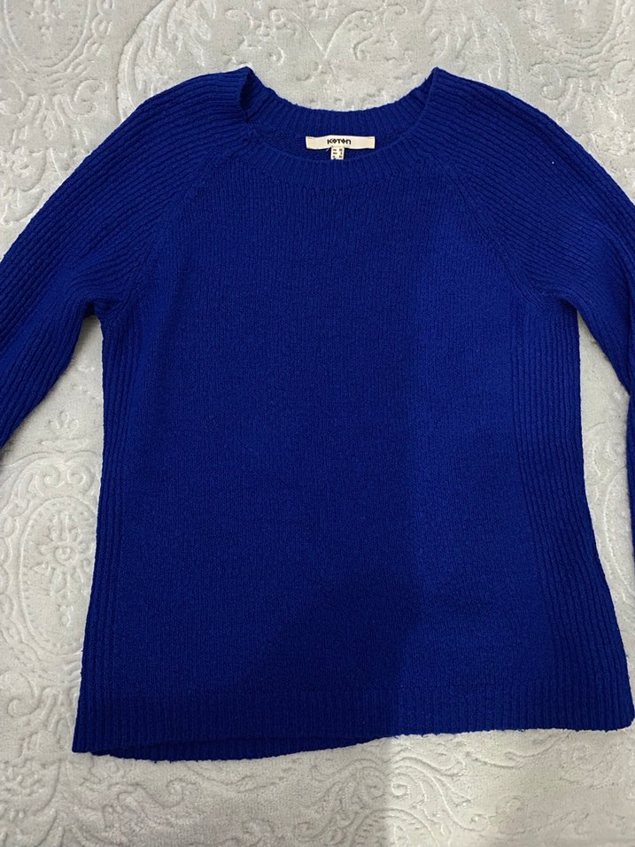 Mavi,, bisiklet yaka ve uzun kollu, yumuşak yün triko kadın kazak. Günlük kullanıma uygun, vücuda oturan kesimde.