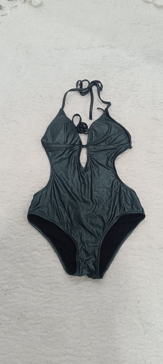 , vücuda oturan mayo, strappy detaylar ve tokalı aksanla cesur goth tarzını yansıtıyor.