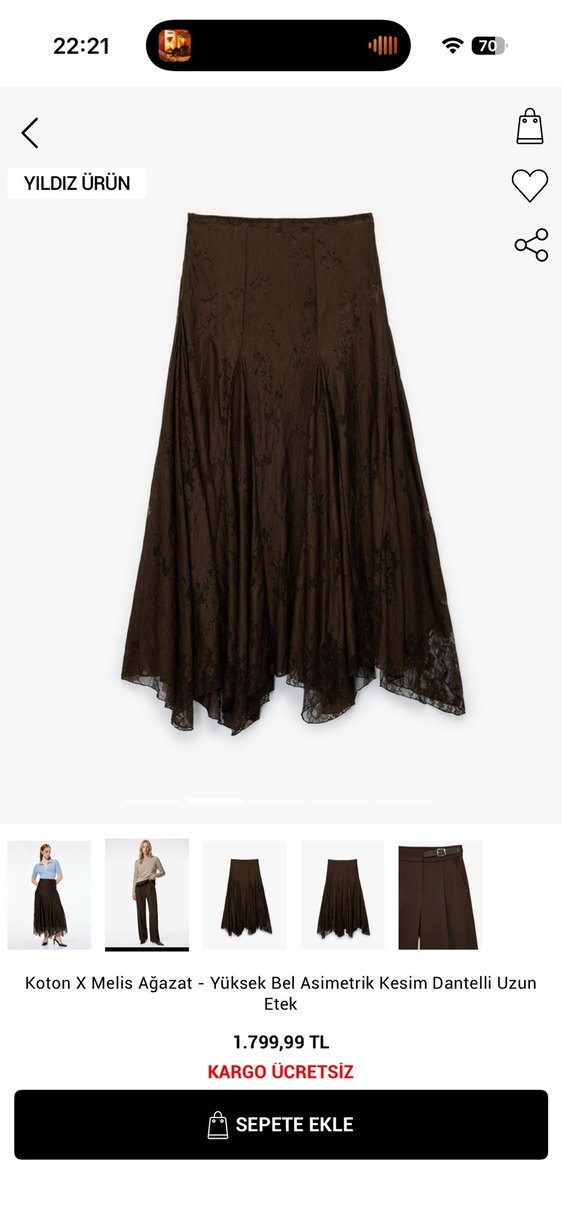 Koyu kahverengi midi etek, yüksek bel ve asimetrik kesimle dantel detaylarına sahiptir. Rahat kesim ve ipeksi kumaşla şık bir ofis görünümü sunar.