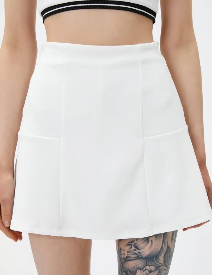 Kırık beyaz renk günlük sokak giyimine uygun, minimal ve sade tasarımlı, vücuda oturan mini etek.