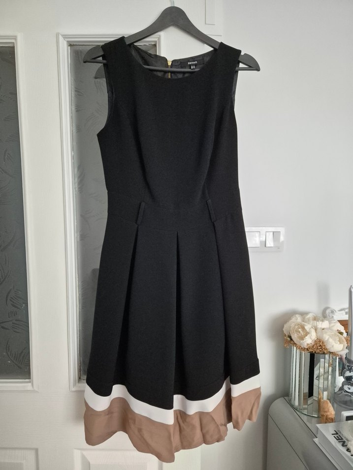 Siyah, kolsuz ve pileli etekli, fitted kesim midi elbise. Beyaz ve bej renk bloklu etek ucu ile modern klasik stilde. 36 beden. Kendi kemerini hiç kullanmadım, başka kemerler taktığım için kemerini bulamadım. Hamile olduğum için olmayan kıyafetleri satıyorum. Hersey fotoğraflarda mevcuttur. Makul tekliflere dönüş yapıyorum.