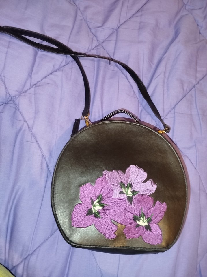 Koton koyu mor çiçek işlemeli siyah suni deri kadın çanta, işlemeli çiçek desenleri ve tokalı detaylara sahip. Yuvarlak formda, elde ve omuzda taşınabilir. Askıları çıkarılabilir. Çift fermuarlıdır. Ürün fotoğraflardaki gibidir.