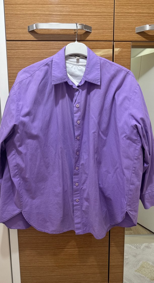 Mor renk, keten kumaştan, düğmeli ve yakalı uzun kollu bol kesim gömlek.