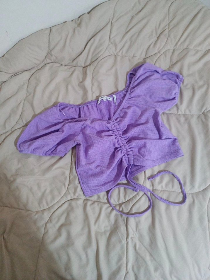 Mor renkte, V yaka ve kısa, büzgülü detaylı mini bluz. Çok fazla giymedim, hatasız