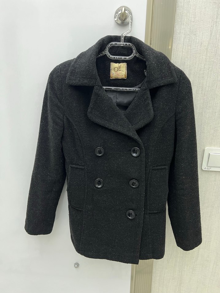 Siyah renkli, önde altı düğmesi olan ve iki yan cebi bulunan klasik yakalı, sıcak dokulu koton marka kaban. İki koltukaltı arası 46cm, boy 73cm.