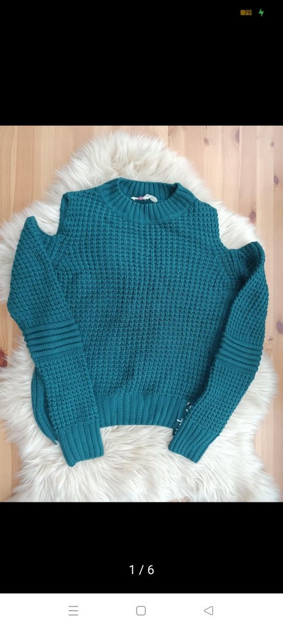 örgü kumaştan uzun kollu, yuvarlak yakalı, rahat kesim kazak. Günlük kullanım için uygundur. omuz başları açık. petrol yeşili gibi bir renk. az giyildi. hiç bir sorunu yoktur. xs beden ama smalla da olur. ben small bedenim, tam oldu. xs un üzerine yapışmaz