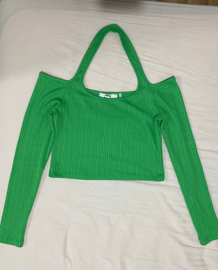 koton marka Uzun kollu ve halter yaka, yeşil renkli, örgü dokulu, vücuda oturan crop top. üstte duşunu ekledim çok güzel bir çimen yeşili tonu