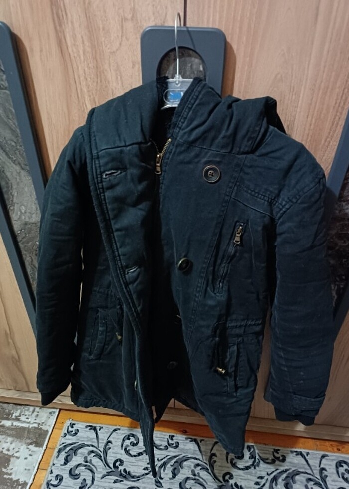 En 48 cm boy 70 cm. İlk günkü gibi siyah değil tabi ama bi kumaş boyasıyla ilk günkü gibi durur. Hiçbir yırtık sökük vs yoktur. Oldukça sağlamdır ve sıcacık tutar. İçinde bile cebi var