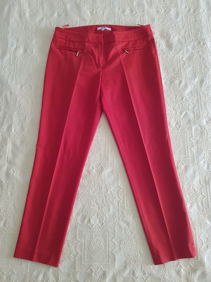 Parlak kırmızı sentetik kumaştan, fermuarlı cep detaylı, midi boy, normal kesim kadın kumaş pantolon. İş ortamı için uygundur. Bel 40 cm boy 86 cm.