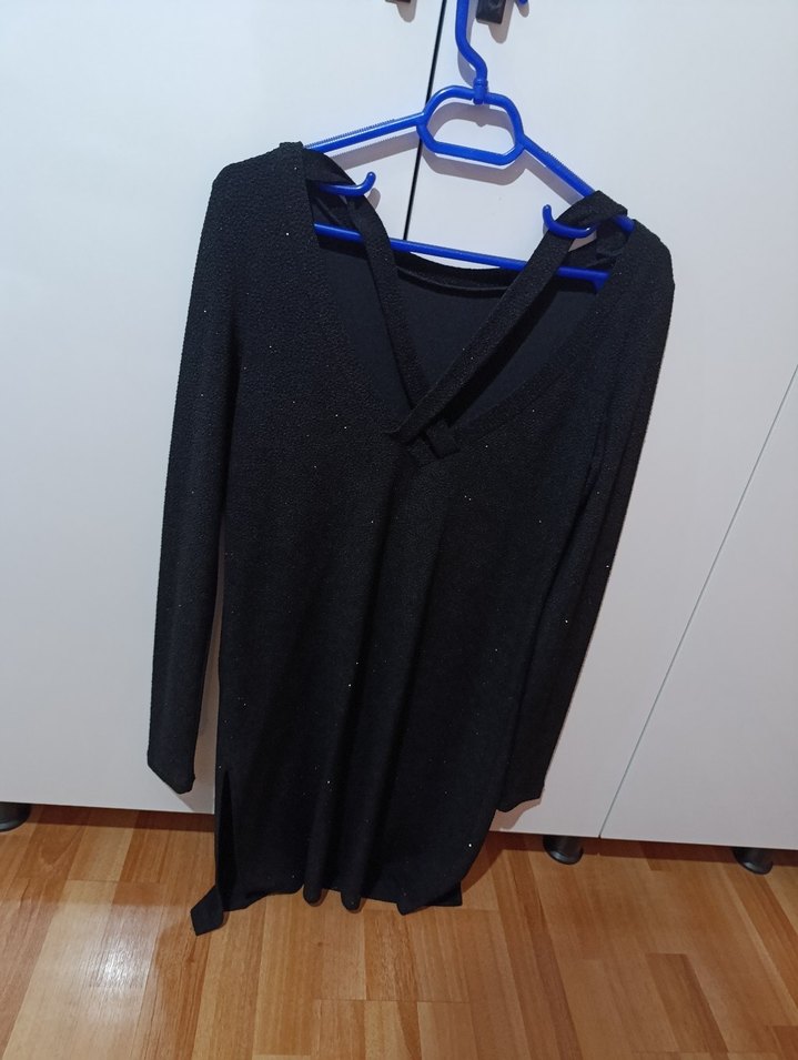 V yaka, uzun kollu, siyah triko elbise. Sentetik yumuşak kumaştan, günlük kullanıma uygun, trendy casual goth tarzında. Sadece bir kez bi davette giydim. S bedendir. Esnek kumaş. 60 kg a kadar olabilir. önden kapalı ve uzun kollu. arkası çapraz detaylı ve hafif sırtı açık. yandan da yaklaşık bir karış yırtmacı var. boyu toplam 90 cm.