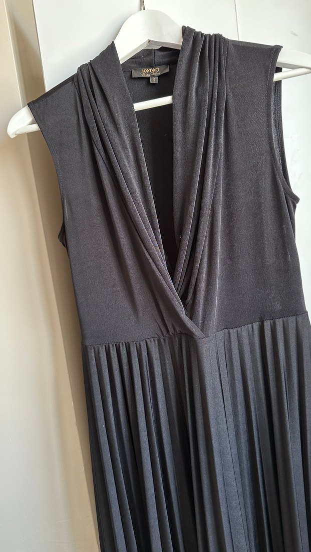 V yaka ve kolsuz, pileli detaylı, uzun kesim siyah abiye elbise. Yumuşak sentetik kumaştan, Midi boy kendinden pileli kolsuz elbise. Herhangidir defosu yoktur temizdir.