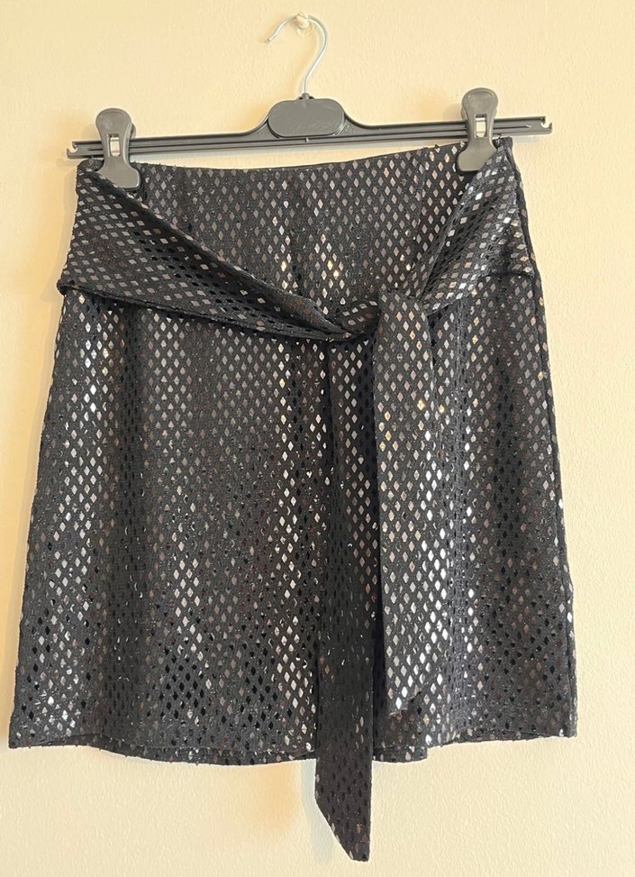 siyah kemerli ve bol kesim mini etek. Romantik akşamlar için uygun, yılbaşı için alındı ancak giyemedim. Tekrar giymeyeceğim için satıyorum. Ölçüleri fotoğrafta mevcut.