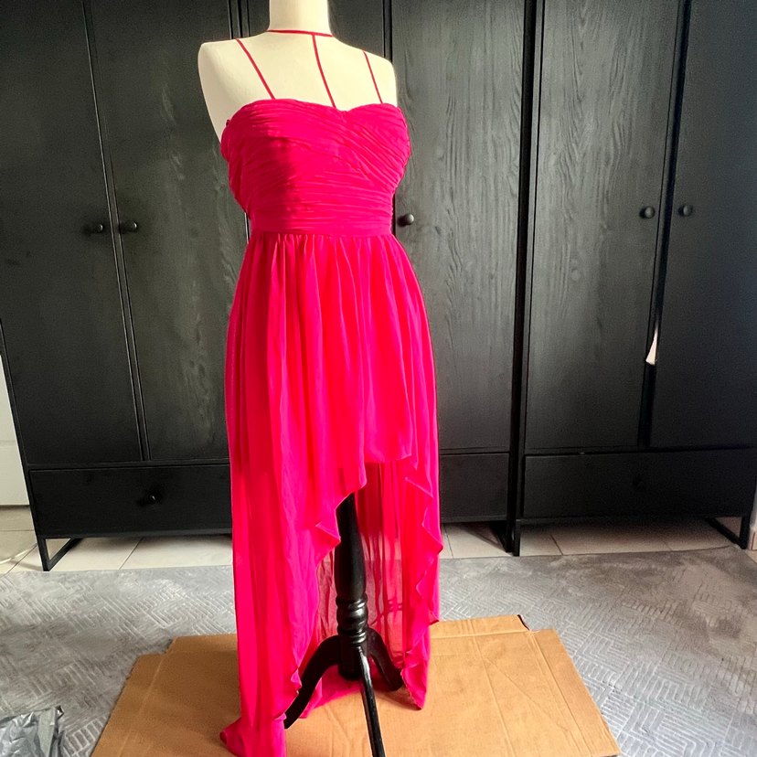 Pembe, askılı ve uzun boylu abiye elbise, drapeli detaylara sahip. Sıkı kesimi ve gösterişli tarzıyla parti için uygundur. Önü kısa arkası uzun şifon elbise