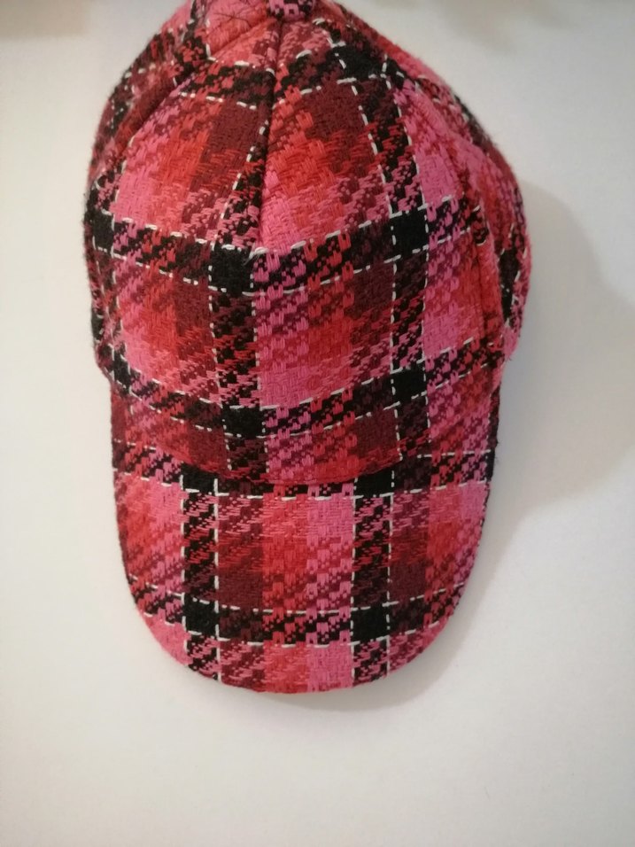 Koton Kadınlar için örme dokulu, pembe ve kırmızı ekose desenli, sentetik kumaştan yapılmış rahat şapka. Renkli ve karşı kültür tarzını yansıtıyor.Hiç kullanılmadı
