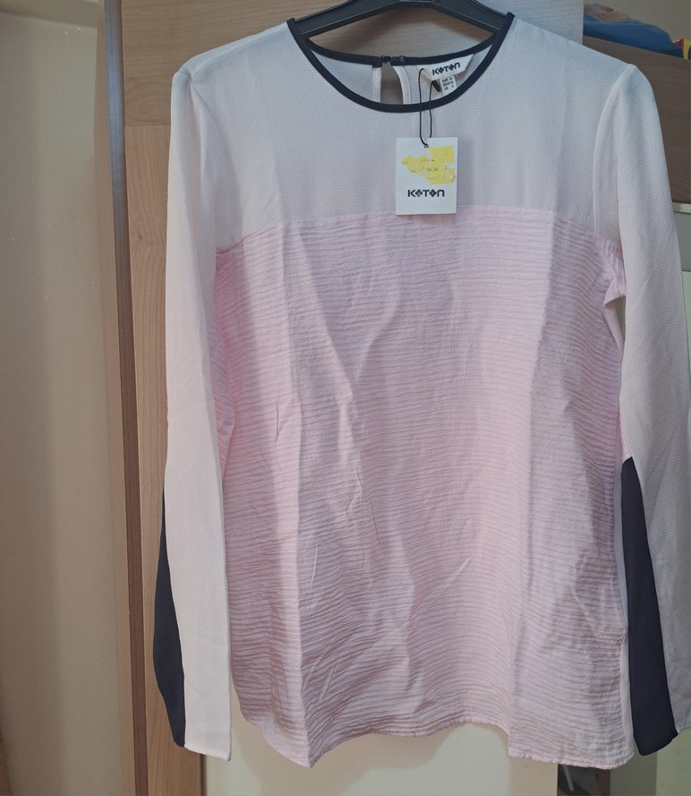 Koton marka, uzun kollu, yuvarlak yaka, normal kesim, pembe piliseli pamuk bluz, günlük kullanıma uygundur.