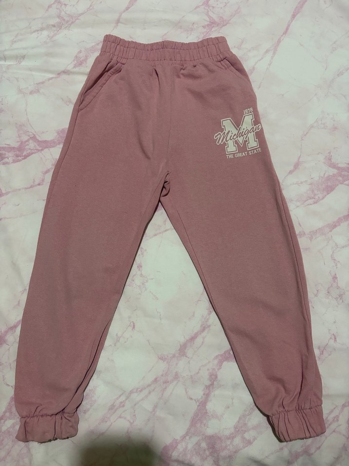 Pembe renk, rahat kesim kız eşofman altı, elastik bel ve paça manşetlerine sahip, yumuşak kumaştan üretilmiştir. Michigan baskısı bulunur.