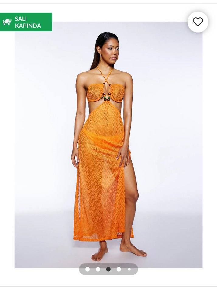 Koton marka XL beden boyundan bağlamalı turuncu, boncuk detaylı, plaj elbisesi.Sorunsuzdur bir kez kullanıldı