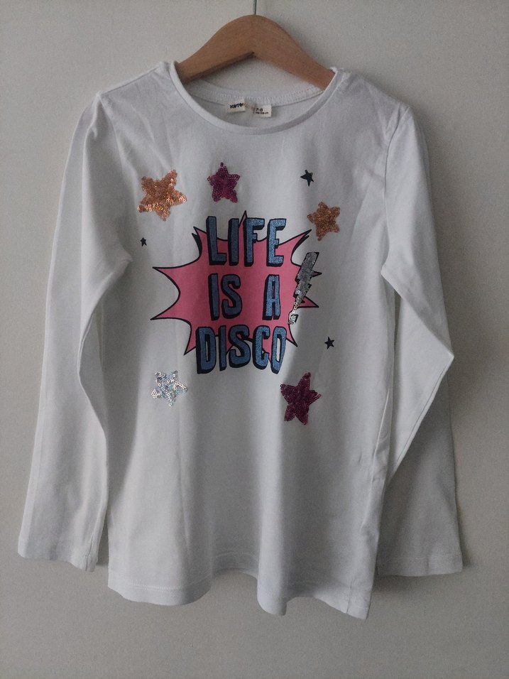 Koton Kids marka, beyaz renkli ve uzun kollu penye tişörttür. 7-8 Yaş'a uygundur. Ürün genel olarak temiz durumdadır, pullarında eksik yoktur. #kotonkids #çocuktişört #pullutişört #kızçocukgiyim #penye