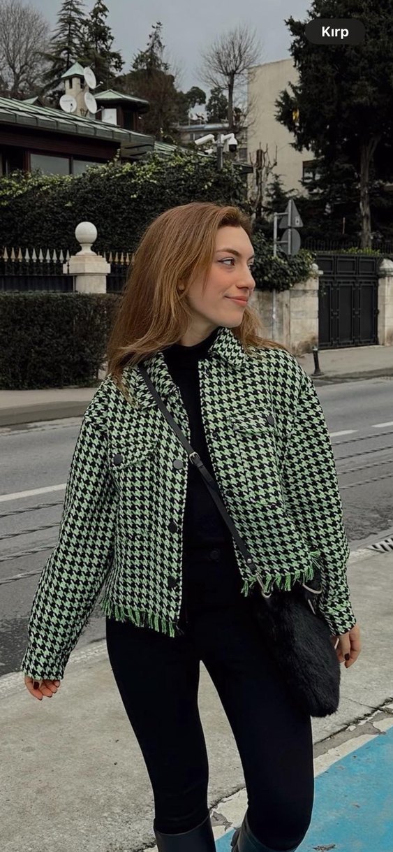 kazayağı desenli, uzun kollu ve normal kesim kadın ceket, günlük sokak tarzı için uygundur. İnce değildir kalın kumaştır