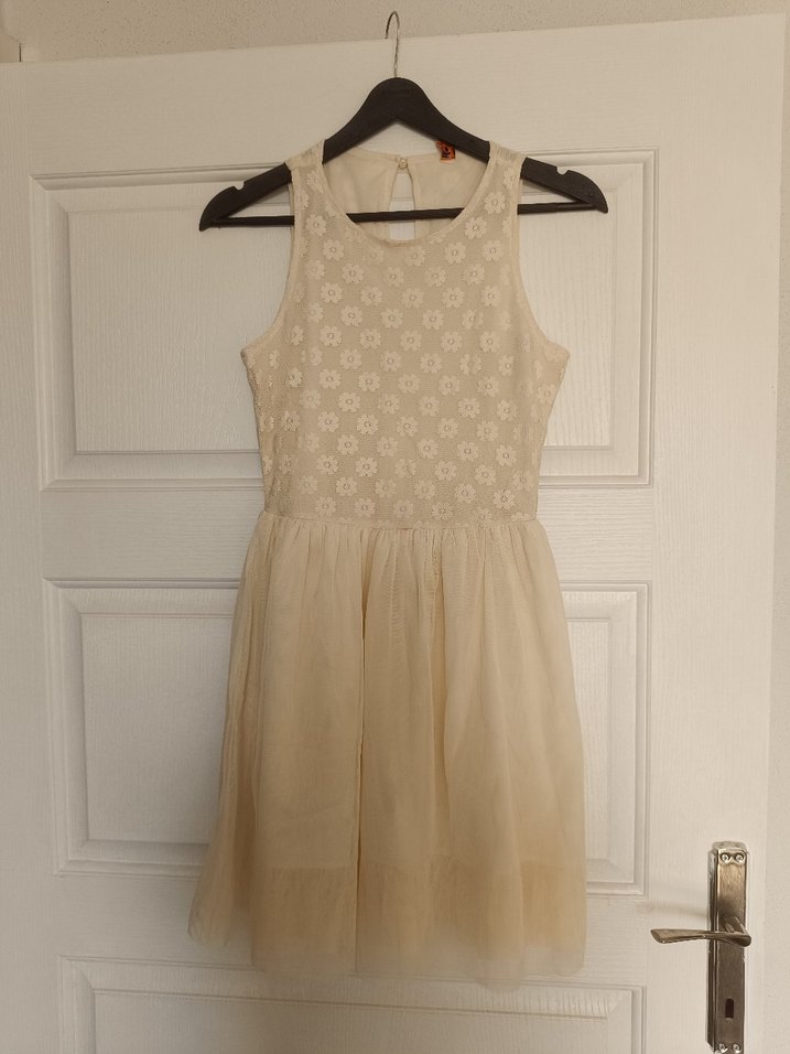 Dantelli, straplez yaka ve fitted kesime sahip bej kız çocuk elbisesi. Hafif sentetik kumaş bohem tarzını yansıtıyor. ürün bir kez kullanılmıştır