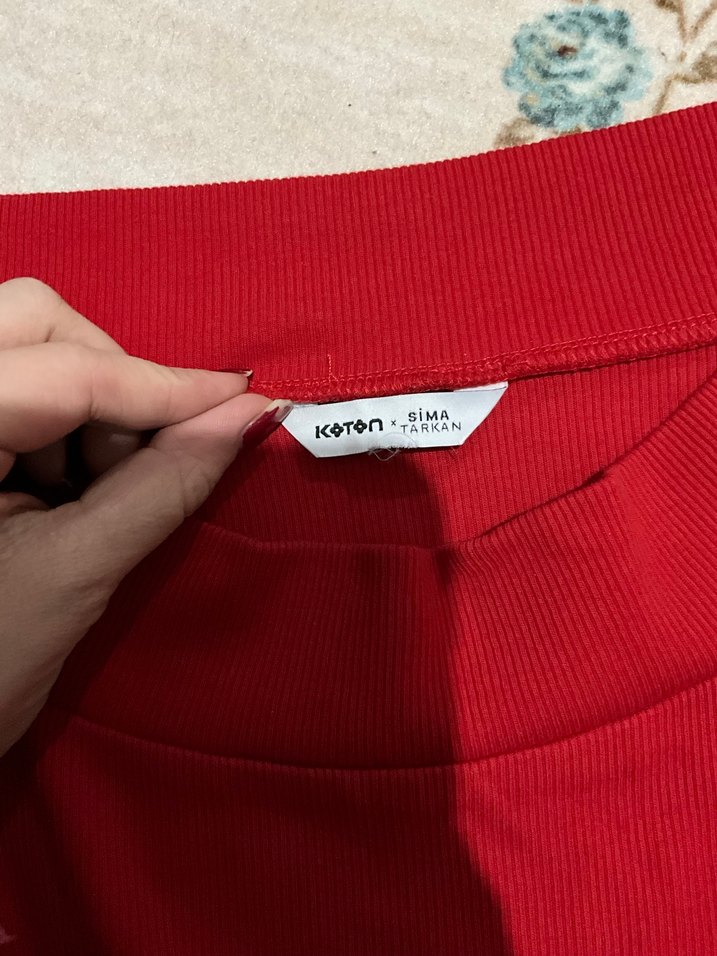 Koton markasının kırmızı crop,üstte kol yanında ufak bi siyahlık var çok belli olmuyor nokta kadar