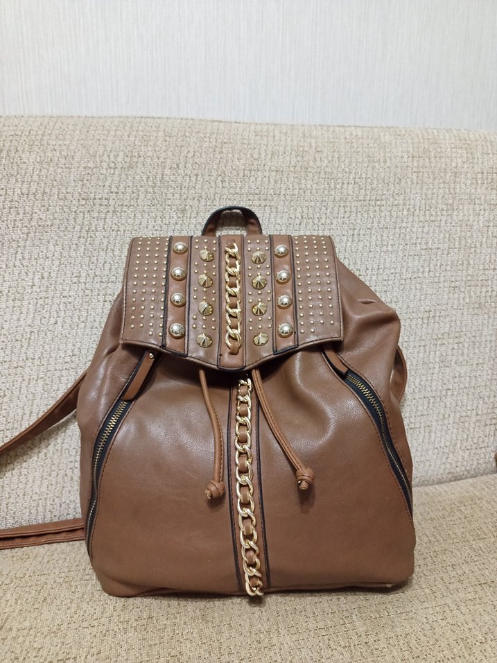 sorununu fotoğrafta belirttimKahverengi deri kadın sırt çantası, tokalı detaylar, parlak yüzey ve süslü perçinlerle bohem tarzda tasarlanmıştır. Günlük kullanıma uygundur.