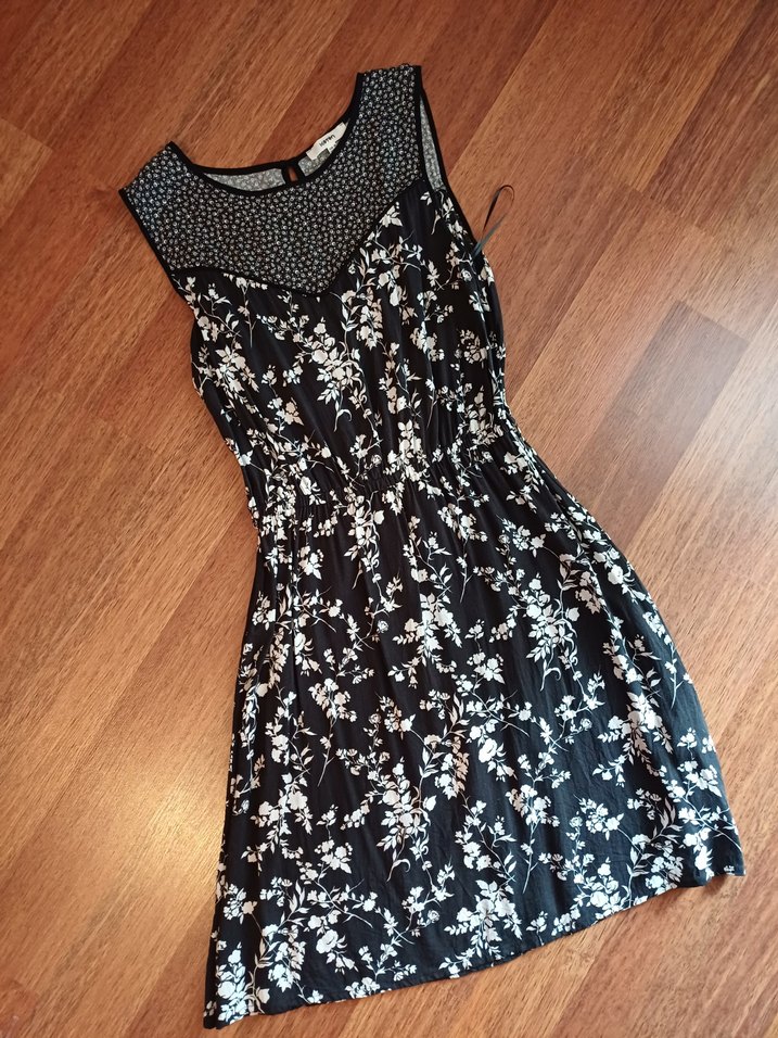 Siyah üzerine beyaz çiçek desenli, dantel detaylı askısız midi elbise.