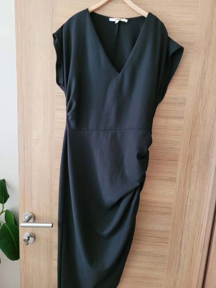 KOTON MARKA V YAKA YANDAN BÜZGÜLÜ YIRTMACLI SİYAH ŞIK ELBİSE 38 BEDEN