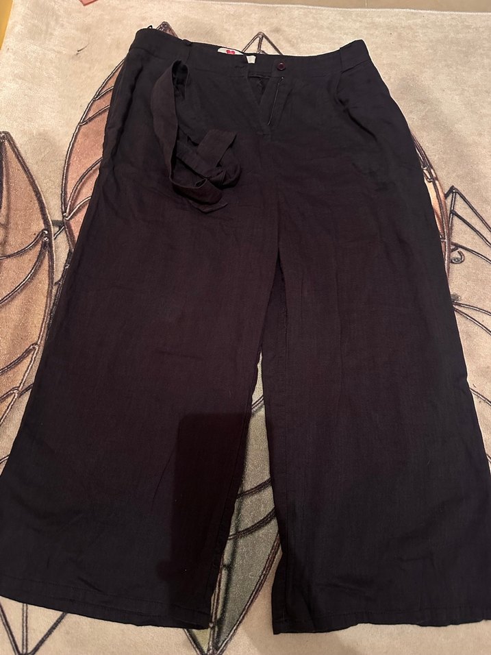 Bol kesim, uzun siyah keten pantolon, kemerli beliyle rahat ve günlük gotik tarz sunar. şile bezi gibi kumaş 38 beden.