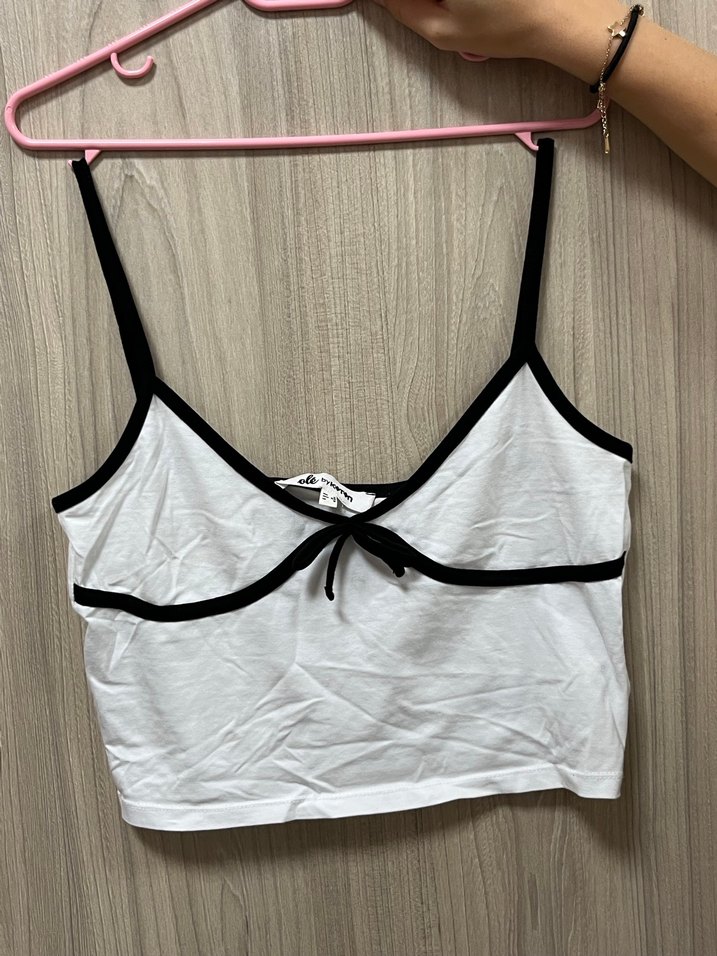 Yumuşak pamuk kumaş üzerinde siyah detaylı beyaz, V yaka ve ince askılı, rahat ve şık kadın atlet.