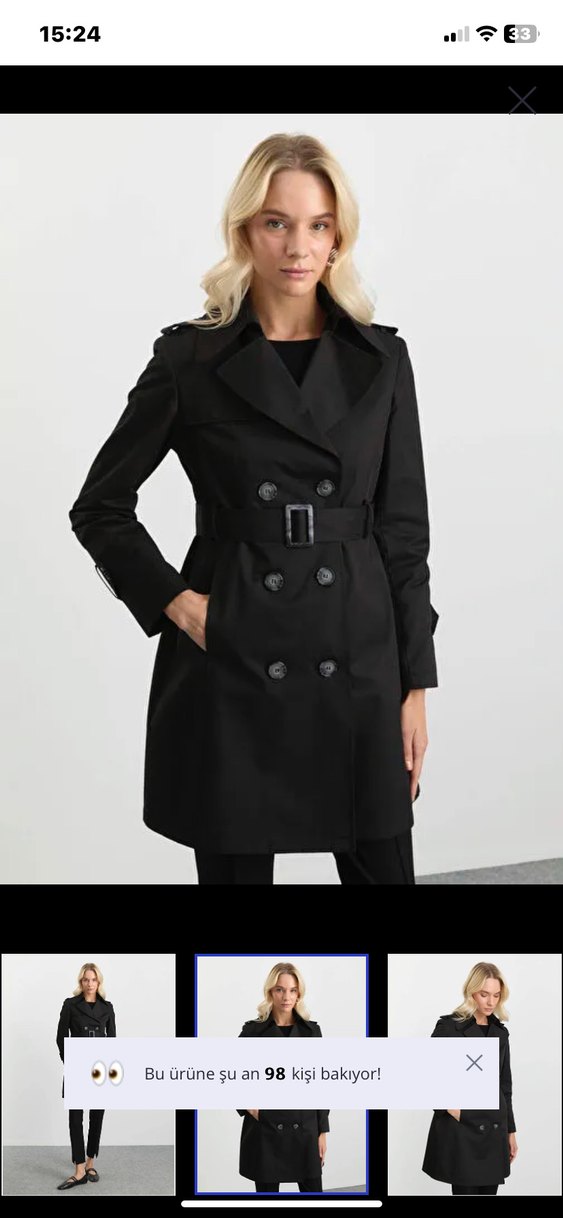 Siyah, kuşaklı midi trençkot. Notch yakalı, uzun kollu ve regular fit. Ofis için uygun, yumuşak sentetik kumaştan. Pazarlık yapabiliriz