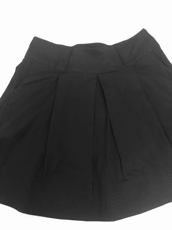 Siyah renkte, pilili ve bol kesim midi mini etek. Sentetik kumaştan, minimalist goth tarzında, ofis kullanımı için uygundur.
