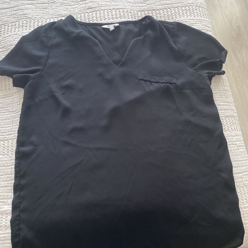 Siyah, V yaka, kısa kollu, bol kesim ve normal boyda kadın bluz. Düz, sentetik dokulu kumaştan, ofis için uygun minimal normcore tarzda.